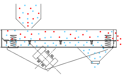 直線振動篩采用雙振動電機(jī)驅(qū)動,其兩電機(jī)軸相對篩面有一傾角,在激振力和物料自重力的合力作用下,物料在篩面上被拋起跳躍式向前作直線運(yùn)動,從而達(dá)到對物料進(jìn)行篩選和分級的目的。